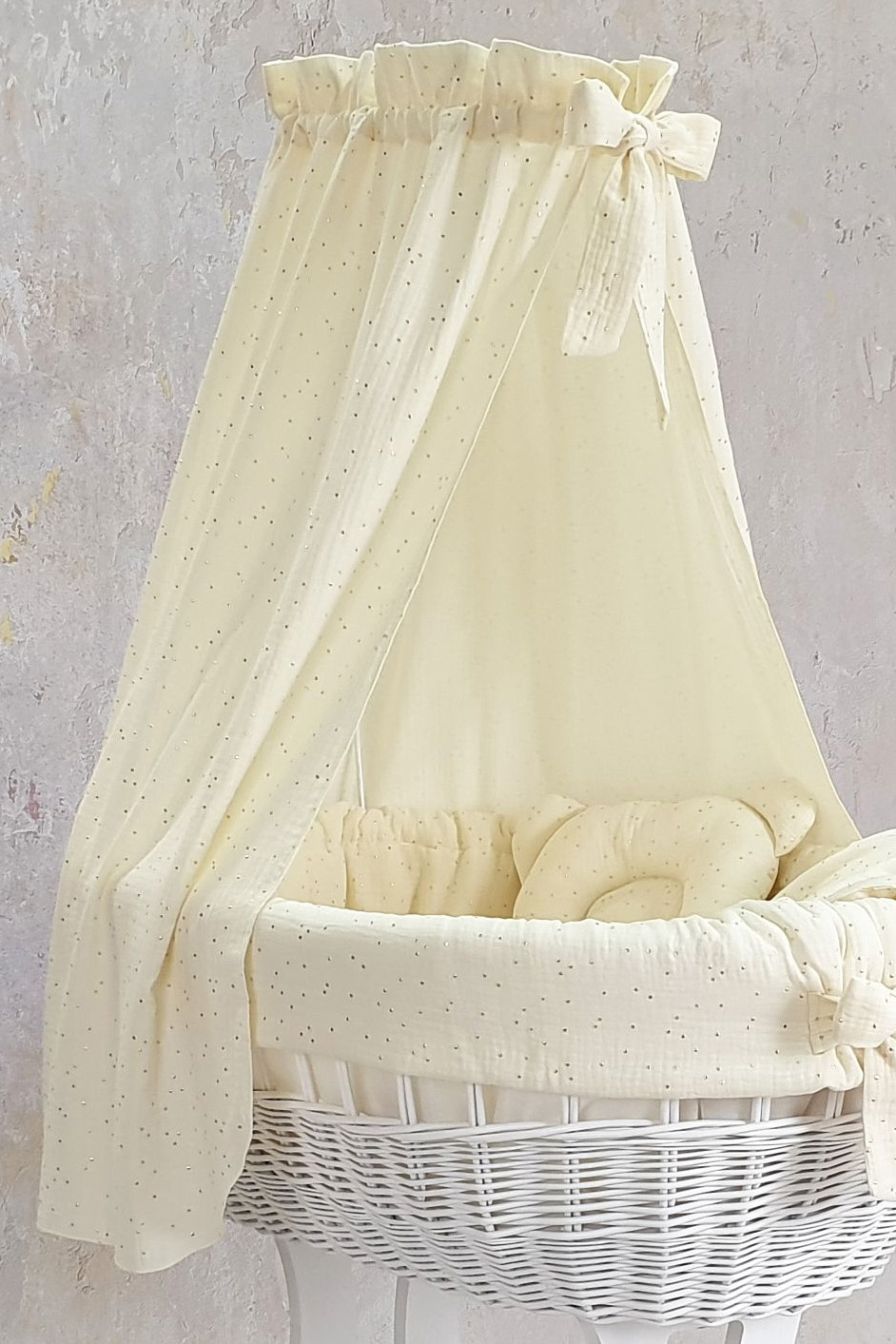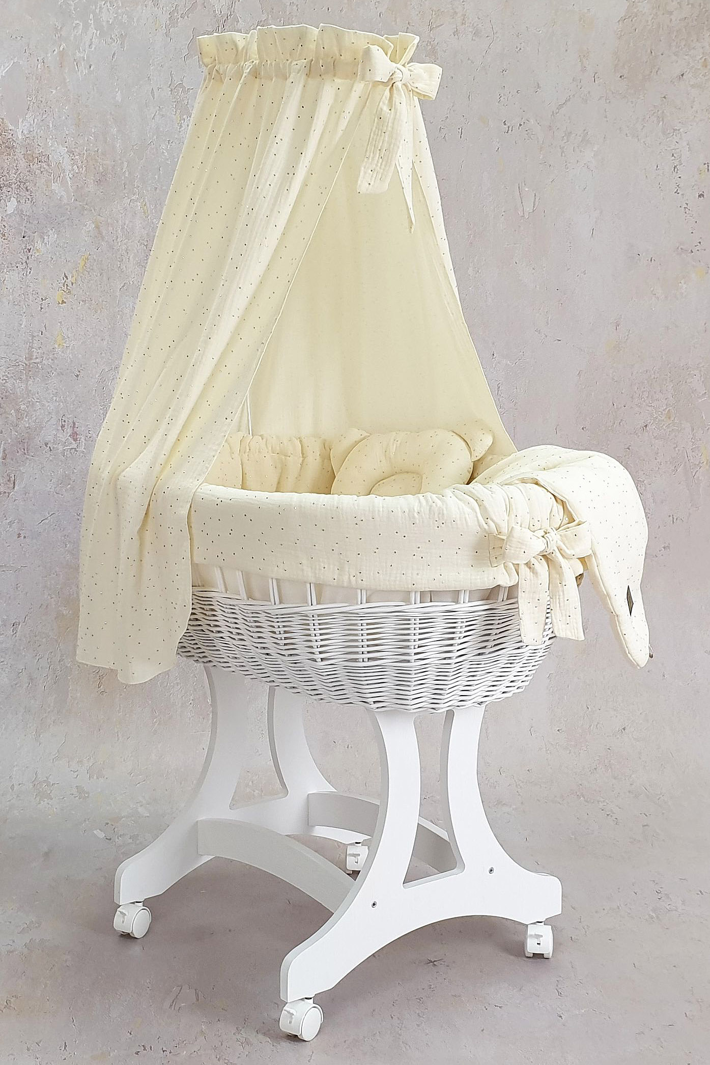 Unser Stubenwagen ist ein wahres Meisterwerk der Handwerkskunst. Die ovale Form des Korbs vermittelt Ihrem Baby ein Gefühl der Sicherheit und Geborgenheit, ähnlich wie in den Armen der Eltern. Stellen Sie sich vor, wie Ihr kleiner Schatz in sanftem Musselin-GOLD schläft, verziert mit zarten goldenen Punkten, die nicht nur optisch ansprechend sind, sondern auch ein weiches und angenehmes Hautgefühl bieten.