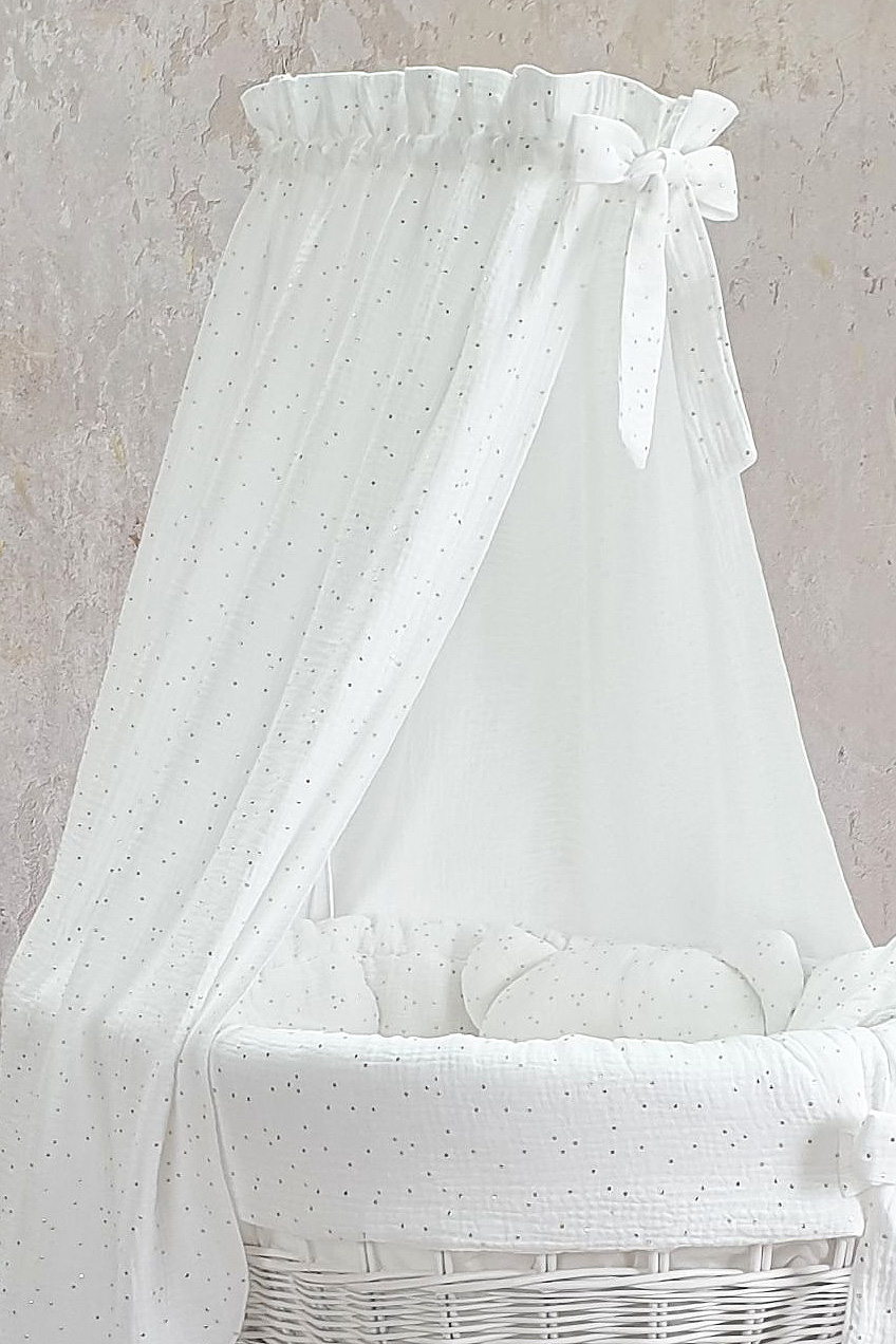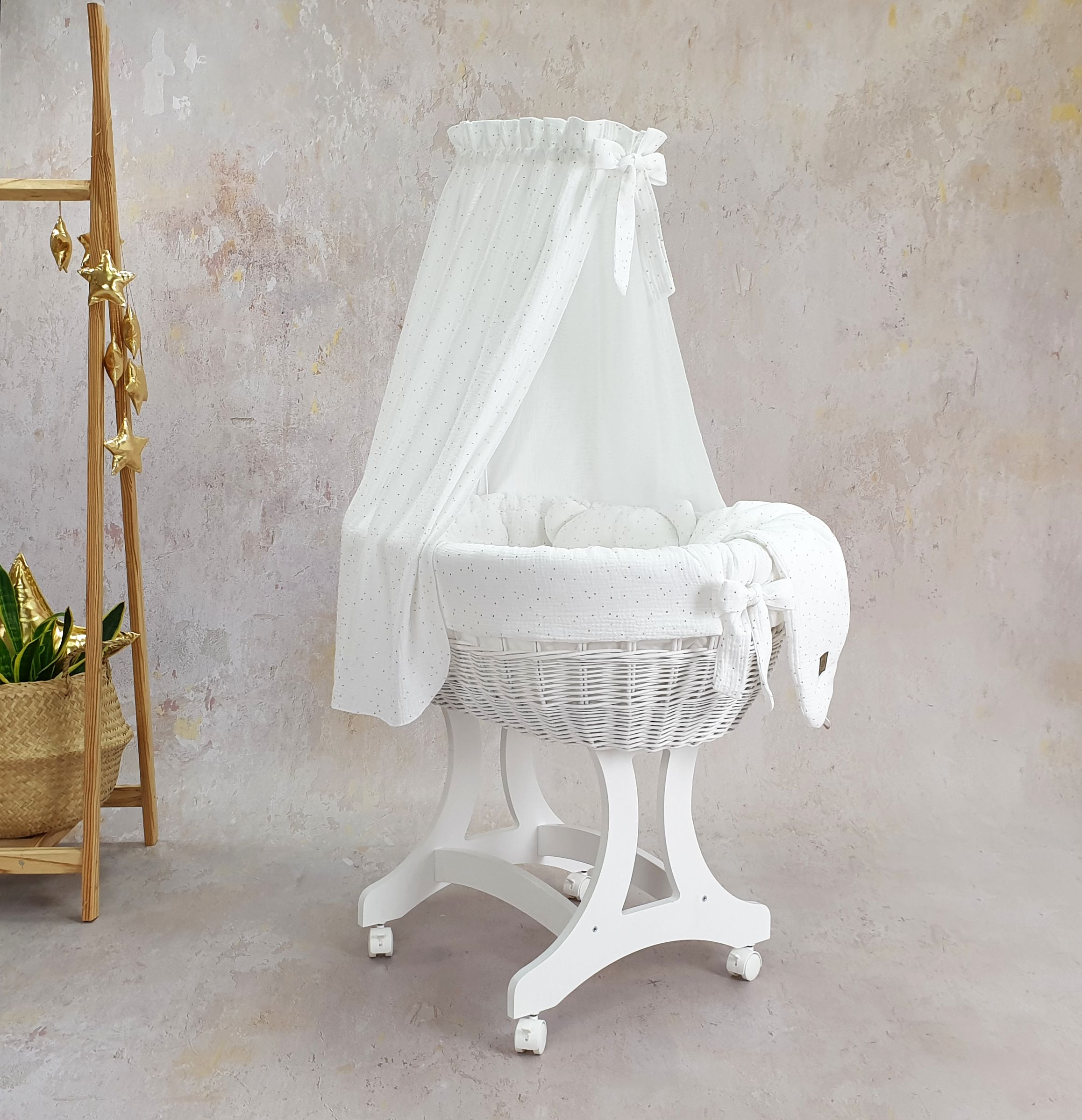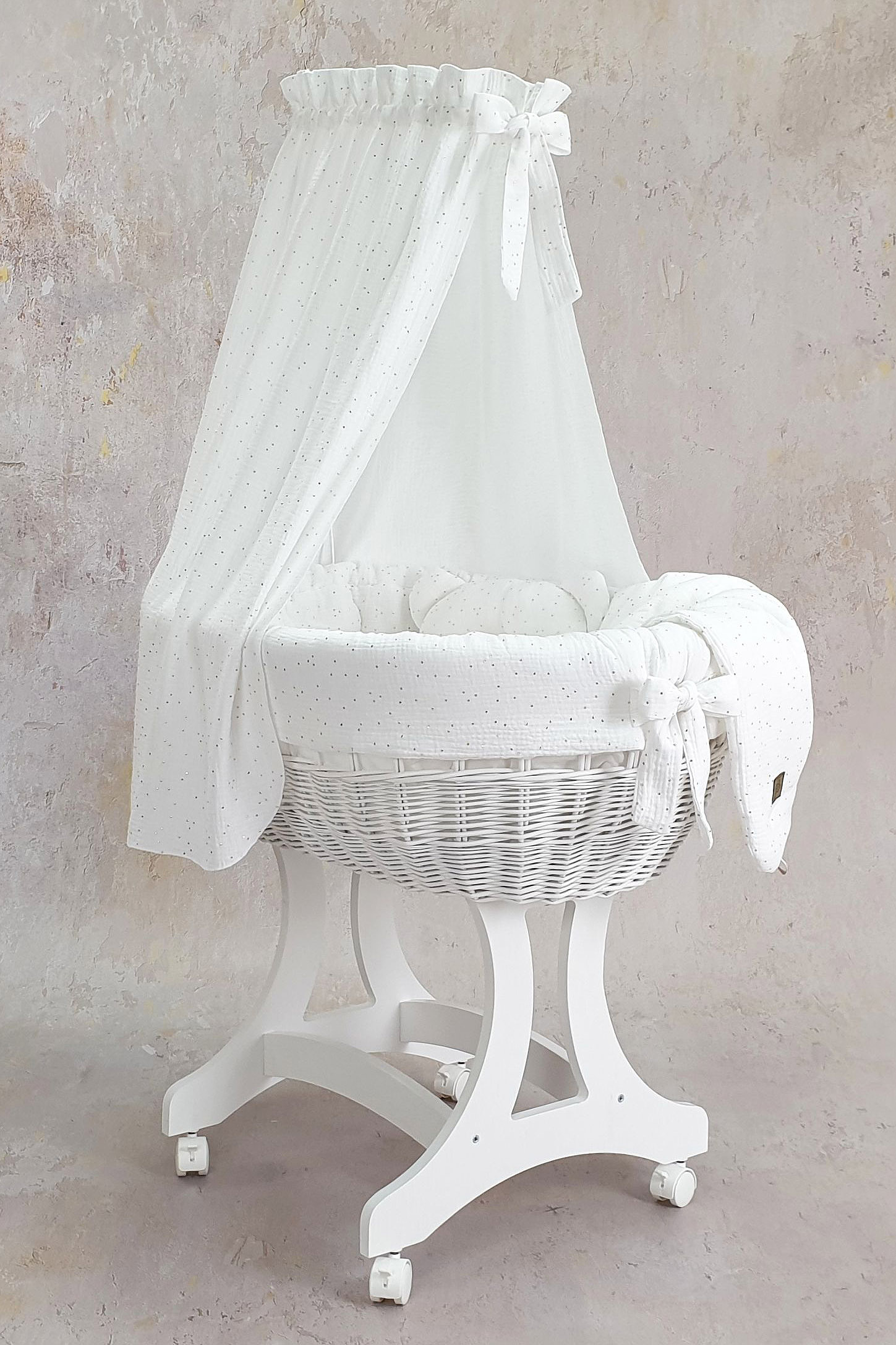 Unser Stubenwagen ist ein wahres Meisterwerk der Handwerkskunst. Die ovale Form des Korbs vermittelt Ihrem Baby ein Gefühl der Sicherheit und Geborgenheit, ähnlich wie in den Armen der Eltern. Stellen Sie sich vor, wie Ihr kleiner Schatz in sanftem Musselin-GOLD schläft, verziert mit zarten goldenen Punkten, die nicht nur optisch ansprechend sind, sondern auch ein weiches und angenehmes Hautgefühl bieten.