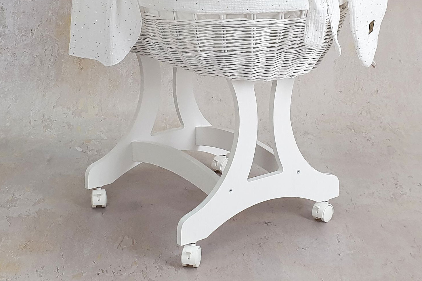 Das Gestell besteht aus langlebigem Sperrholz, während der handgefertigte Korb aus polnischer Weide gefertigt ist. Diese Kombination macht den Stubenwagen nicht nur robust, sondern auch zu einem ästhetischen Highlight. Die vier drehbaren Rollen mit Bremsen bieten maximale Sicherheit und ermöglichen eine mühelose Bewegung des Wagens. Egal, ob im Wohnzimmer, Schlafzimmer oder auf der Terrasse – der Stubenwagen lässt sich problemlos und geräuschlos bewegen und passt sich nahtlos jeder Umgebung an.
