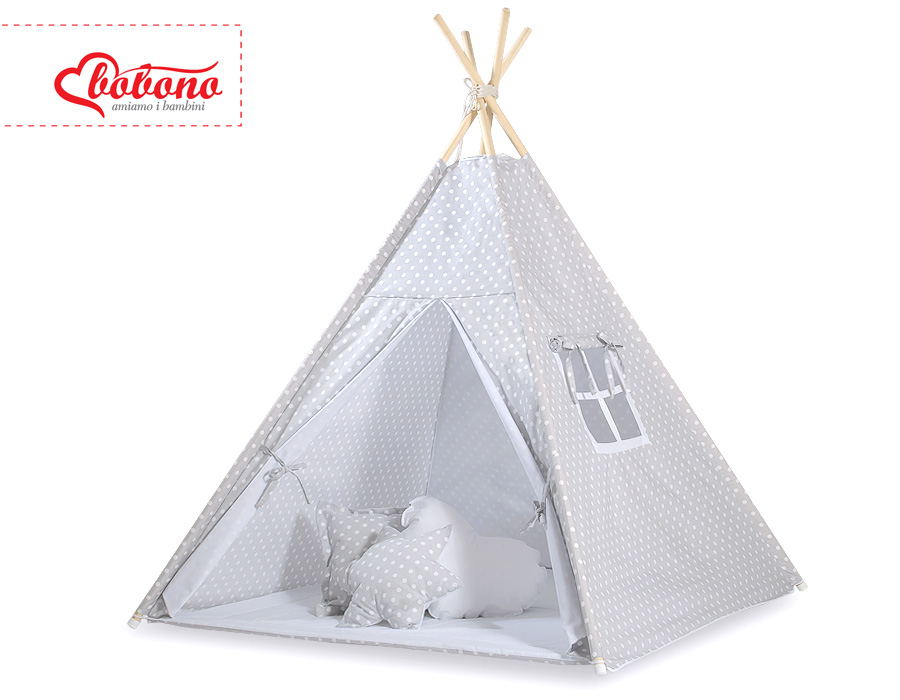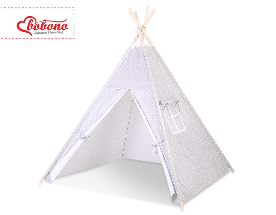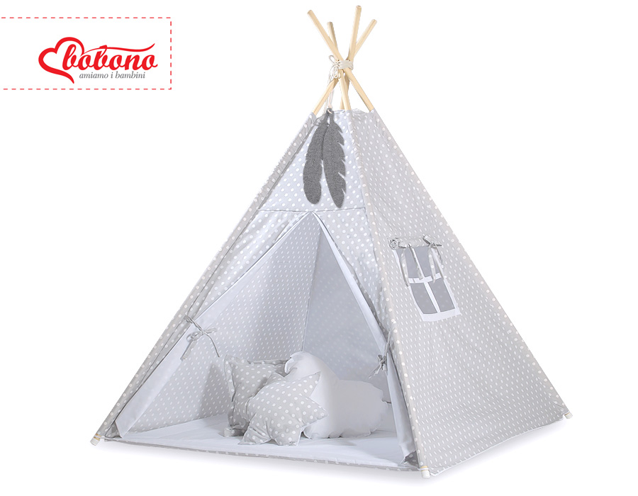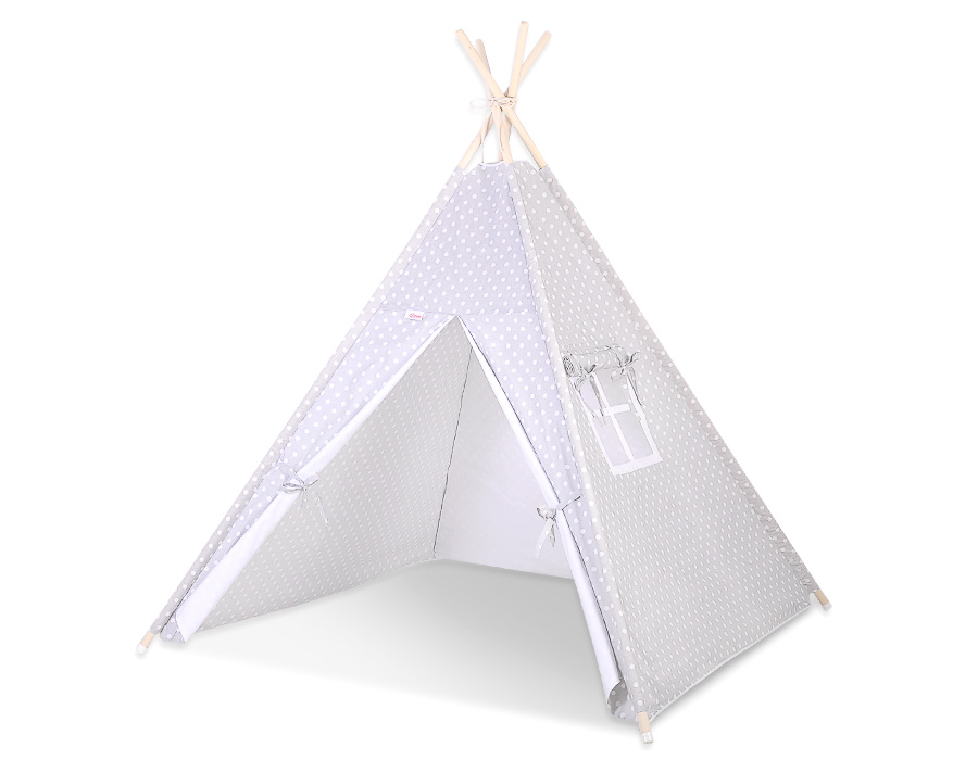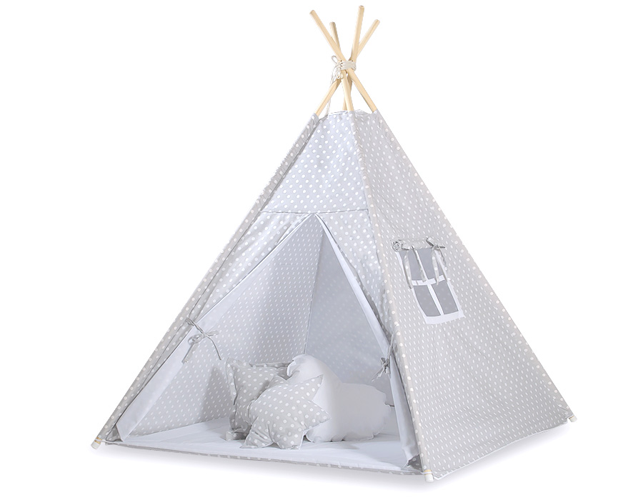 Teepee Zelt Kinder + Schmuckfedern GRATIS! - Grau-Punktemuster