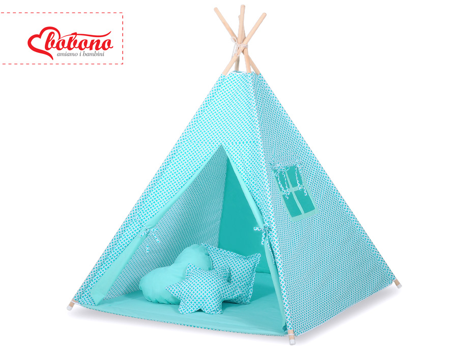 - Komplettes Zelt mit Holzstangen Befestigungsschnur, Spielmatte.