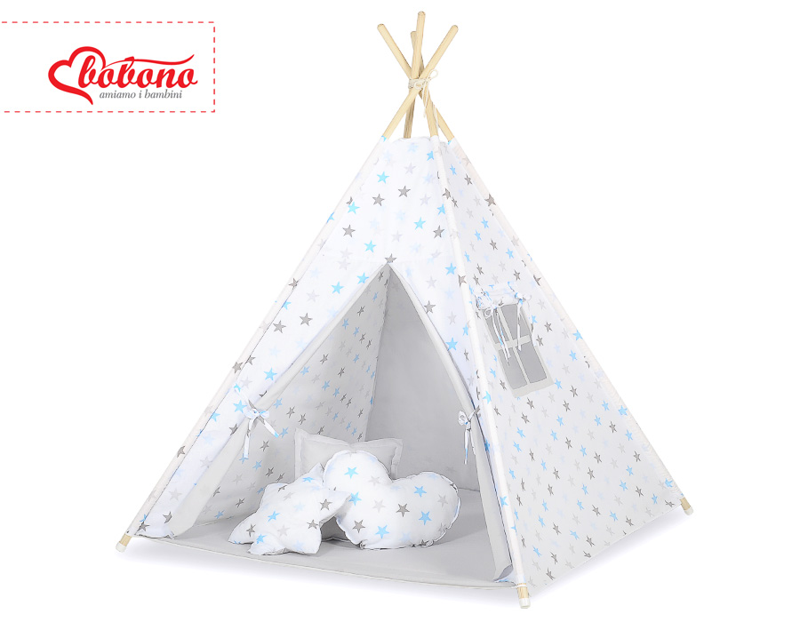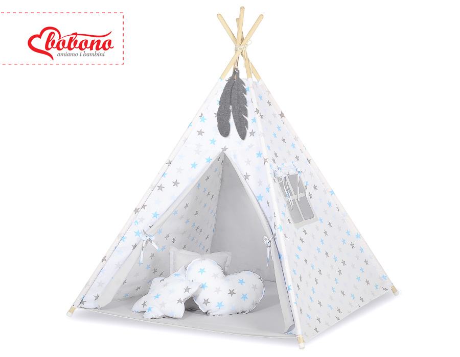 Teepee Kinderspiel-Zelt + Schmuckfedern GRATIS! - Grau-blaue Sternen/grau