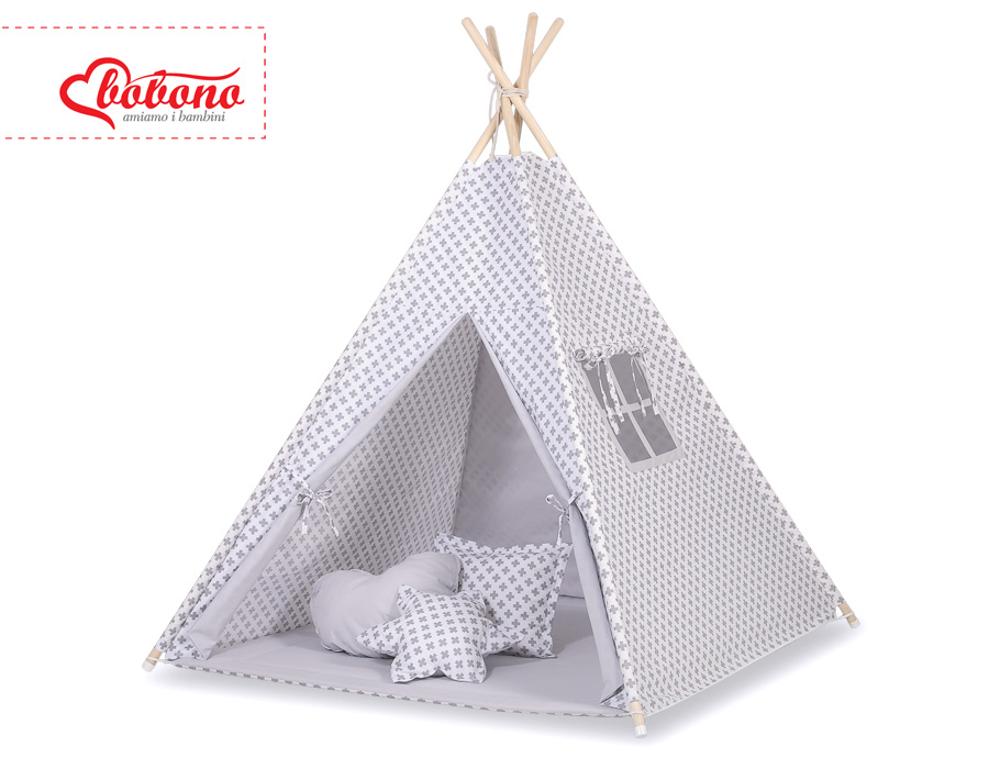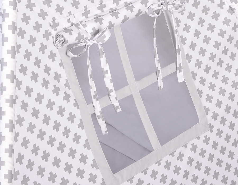Stubenwagen » Spielzeug Kuscheltiere » Teepee Kinderspiel-Zelt » Teepee Kinder Spielzelt » Teepee Kinderspiel-Zelt + Schmuckfedern GRATIS! - Grau-Kreuzmuster