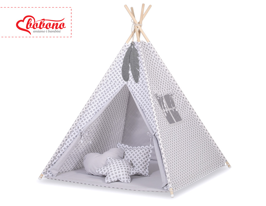 Teepee Kinderspiel-Zelt + Schmuckfedern GRATIS! - Grau-Kreuzmuster