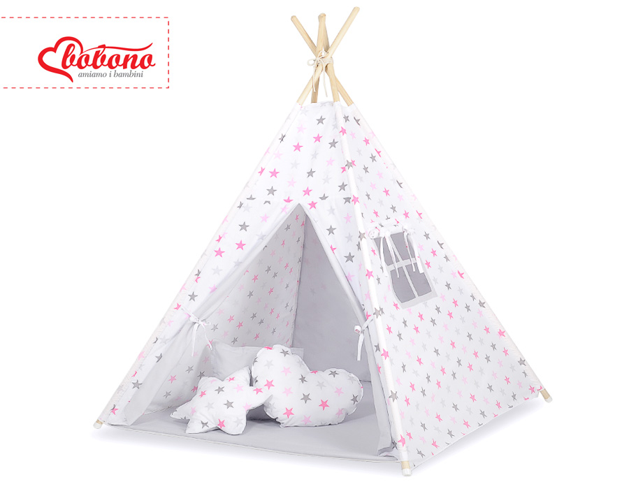 - Komplettes Zelt mit Holzstangen Befestigungsschnur, Spielmatte, zwei große Schmuckfedern aus Filz.