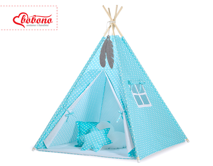 Teepee Zelt Kinder + Schmuckfedern GRATIS! - Türkis-Punktemuster