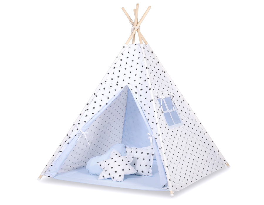 - Komplettes Zelt mit Holzstangen Befestigungsschnur, Spielmatte, zwei große Schmuckfedern aus Filz.