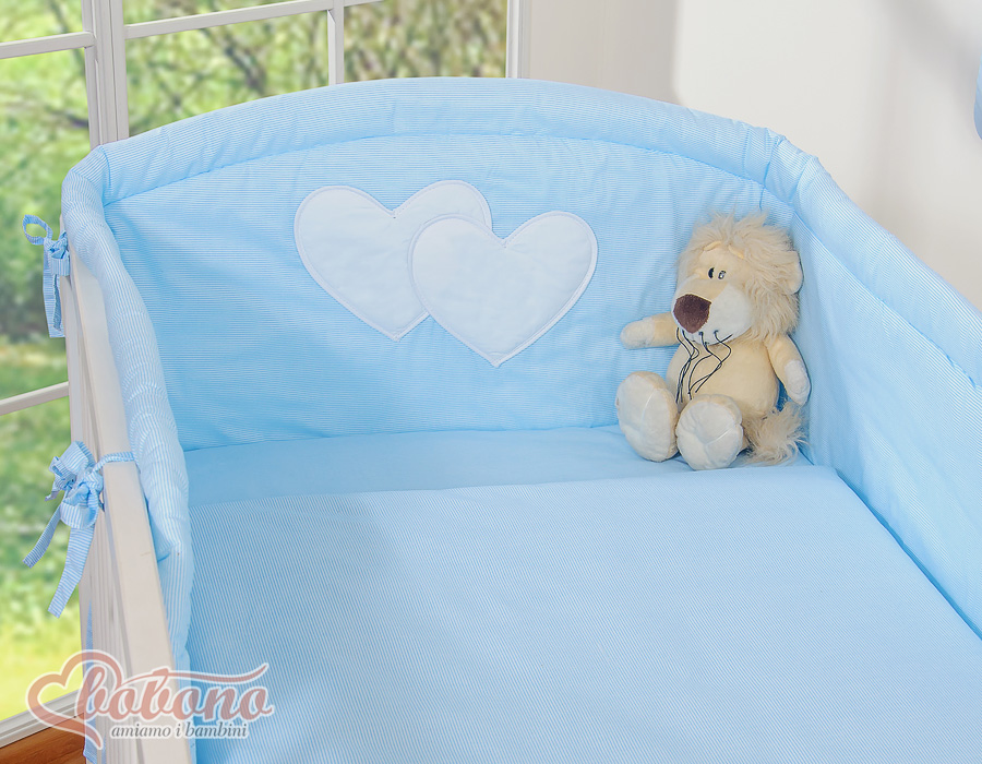 Stubenwagen » Bettwäsche für Babys » Bettwäsche für Babybett HERZEN » Bettwäsche Sets für Babybett 120cm » Universal Kopfschutz » Universal Babybett Kopfschutz - Hängende Herzen blau gestreift