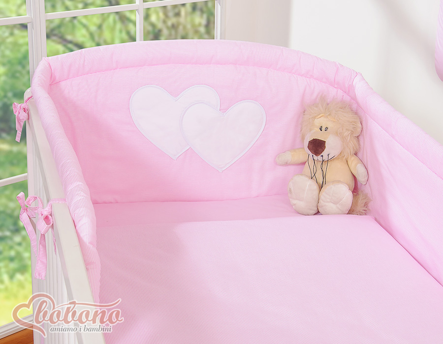Universal Babybett Kopfschutz - Hängende Herzen rosa gestreift Ein universal, atmungsaktiver Kopfschutz mit Seitennähte für Kinderbett. Schafft mit der passenden Bettwäsche eine behagliche Schlafhöhle.