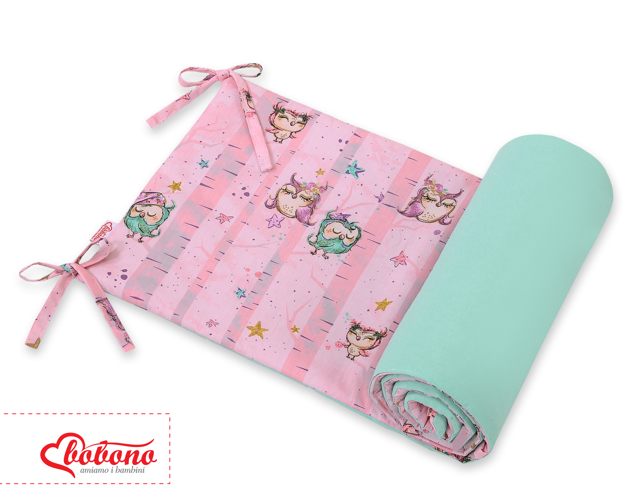 Für Kinderbett 60x120cm oder 70x140cm. Rosa-minze Eulen Babybett Bettumrandung Universal