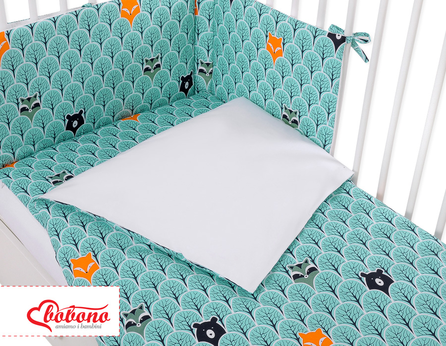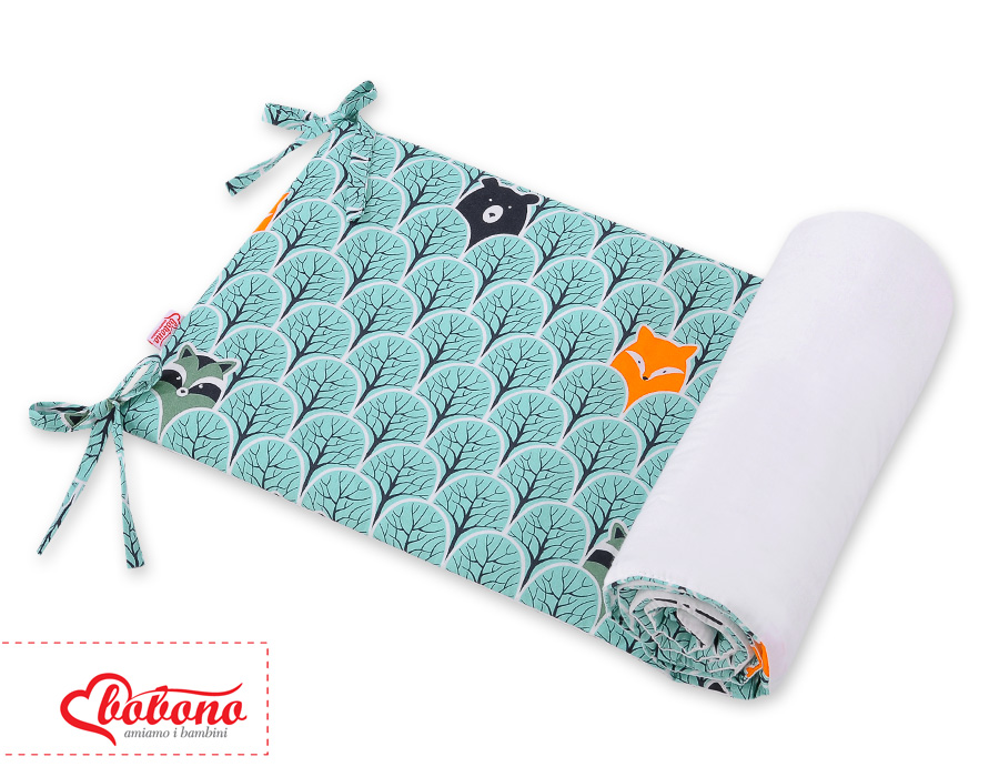 Universal Bettumrandung für Babybett - Minze Bäume Ein universal, atmungsaktiver Kopfschutz für Kinderbett. Schafft mit der passenden Bettwäsche eine behagliche Schlafhöhle.