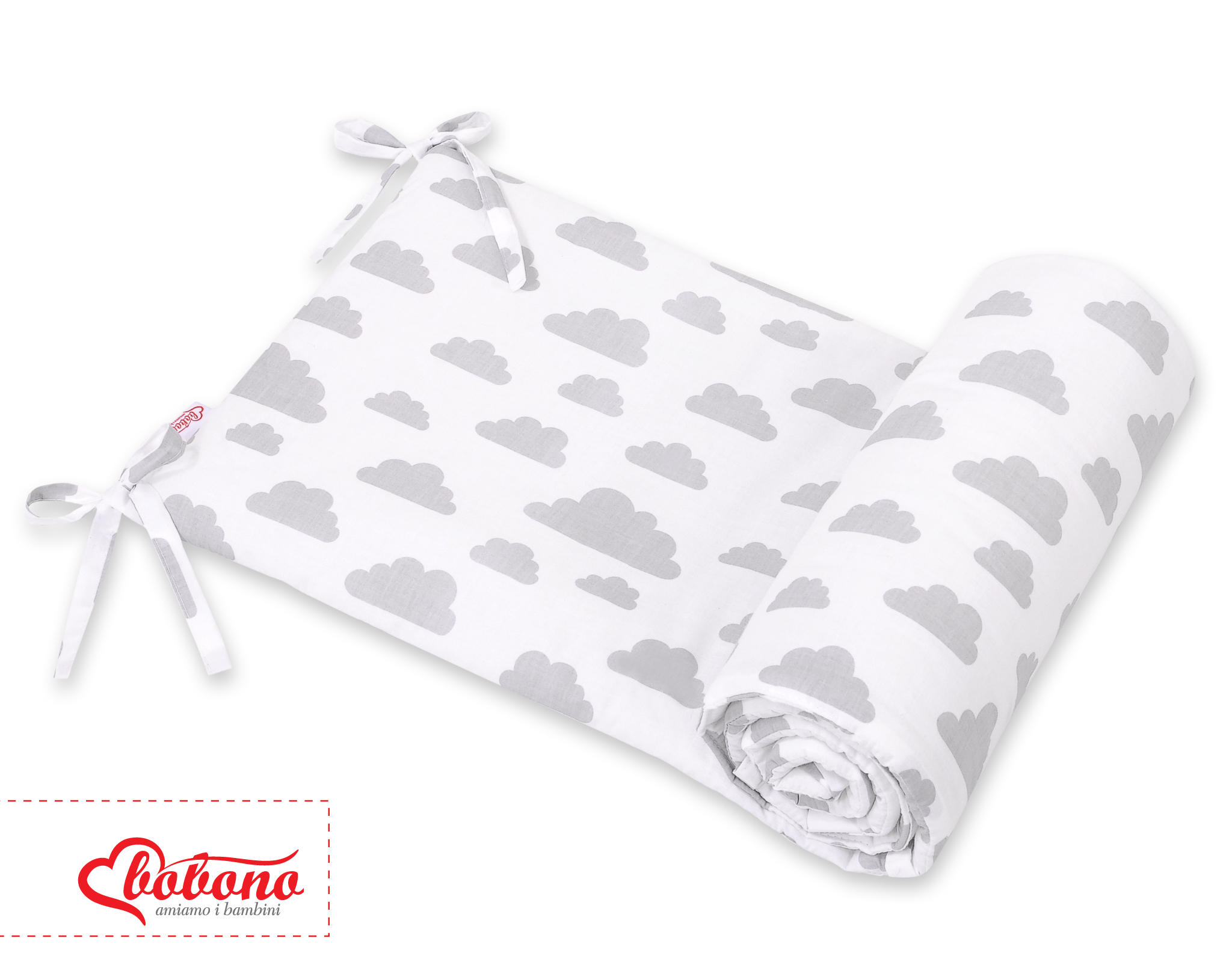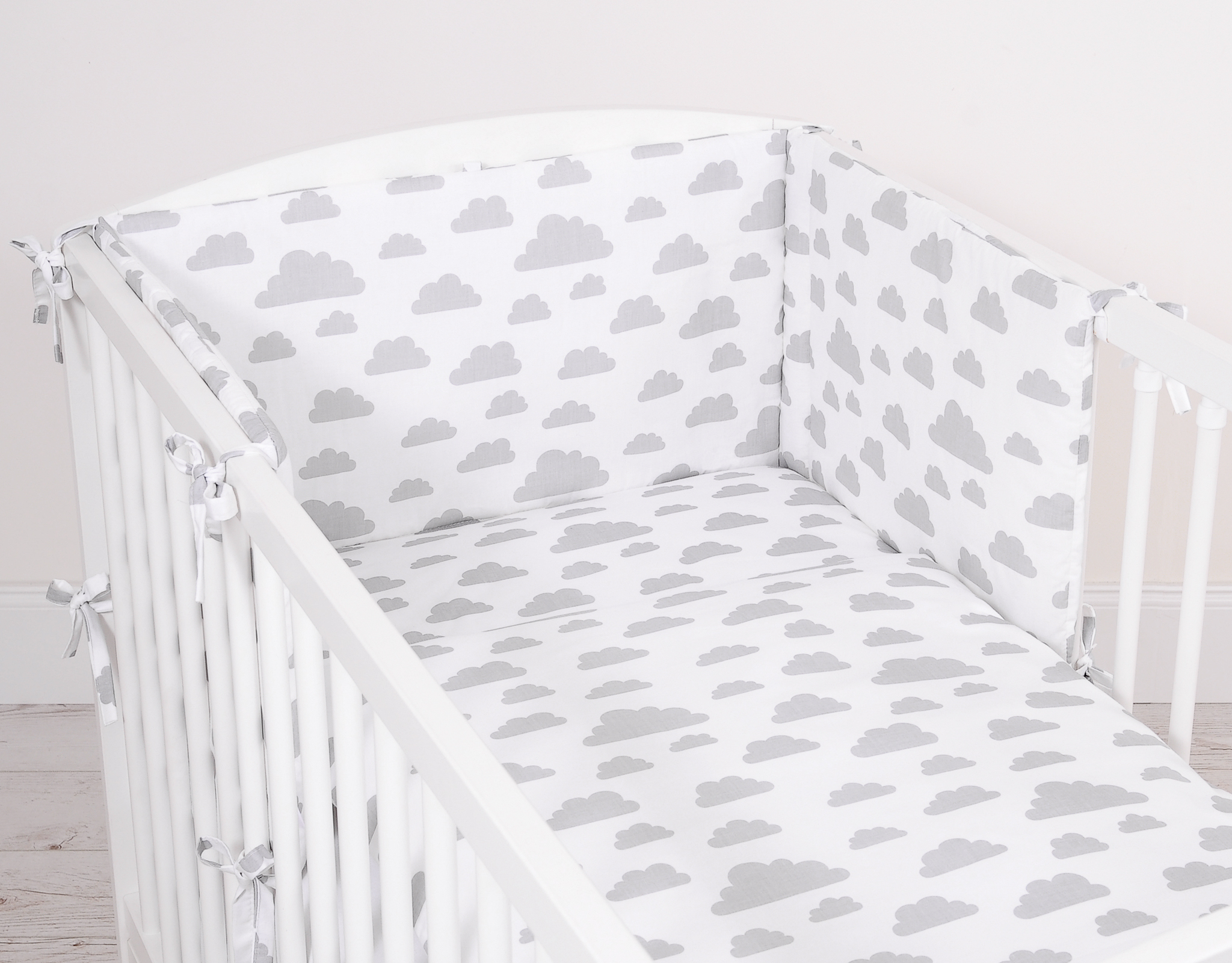 Universal Bettumrandung für Babybett - Wolken grau Ein universal, atmungsaktiver Kopfschutz für Kinderbett. Schafft mit der passenden Bettwäsche eine behagliche Schlafhöhle.