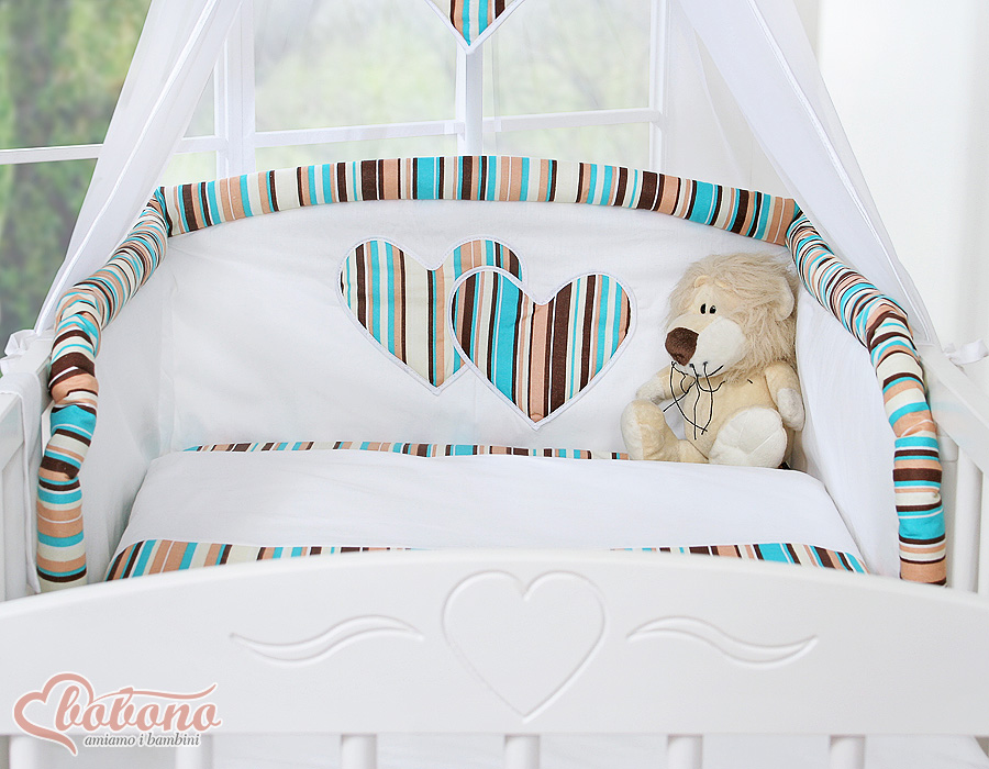 Universal Kopfschutz für Babybett - Hängende Herzen braun gestreift Ein universal, atmungsaktiver Kopfschutz mit Seitennähte für Kinderbett. Schafft mit der passenden Bettwäsche eine behagliche Schlafhöhle.