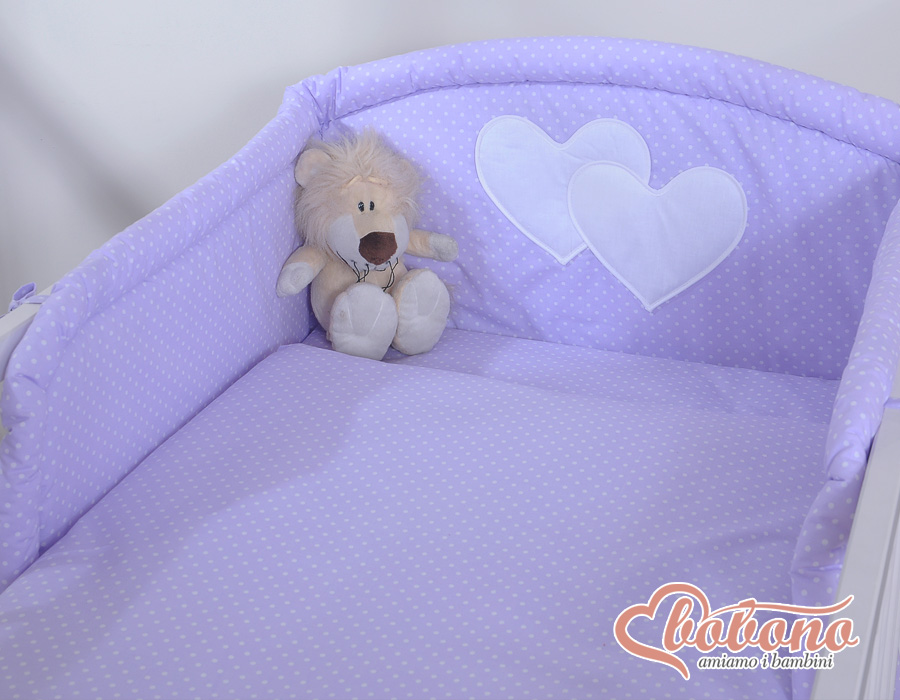 Universal Kopfschutz für Babybett - Hängende Herzen Lila-Punktemuster Ein universal, atmungsaktiver Kopfschutz mit Seitennähte für Kinderbett. Schafft mit der passenden Bettwäsche eine behagliche Schlafhöhle.