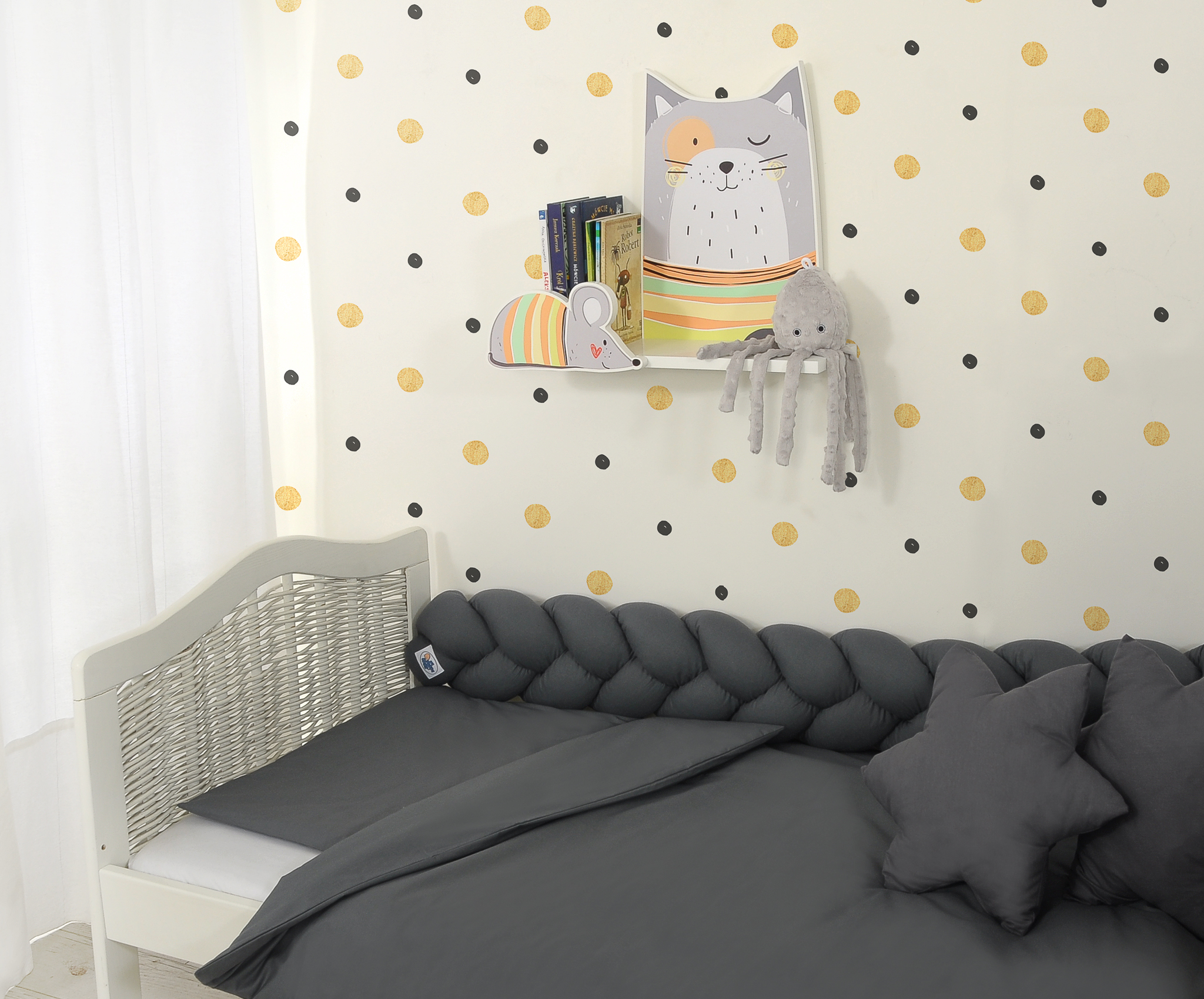 (Sicher für Spielzeug). Die Farbe ist Widerstandsfähig gegen Splitter und Kratzer. Die Rückseite des Regals ist mit bunten Originalgrafiken verziert. Auf der Vorderseite das zusätzliche Element ist auch mit bunten Grafiken verziert, die zusätzlich zur Dekoration dient und sichert Bücher oder anderes Spielzeug.