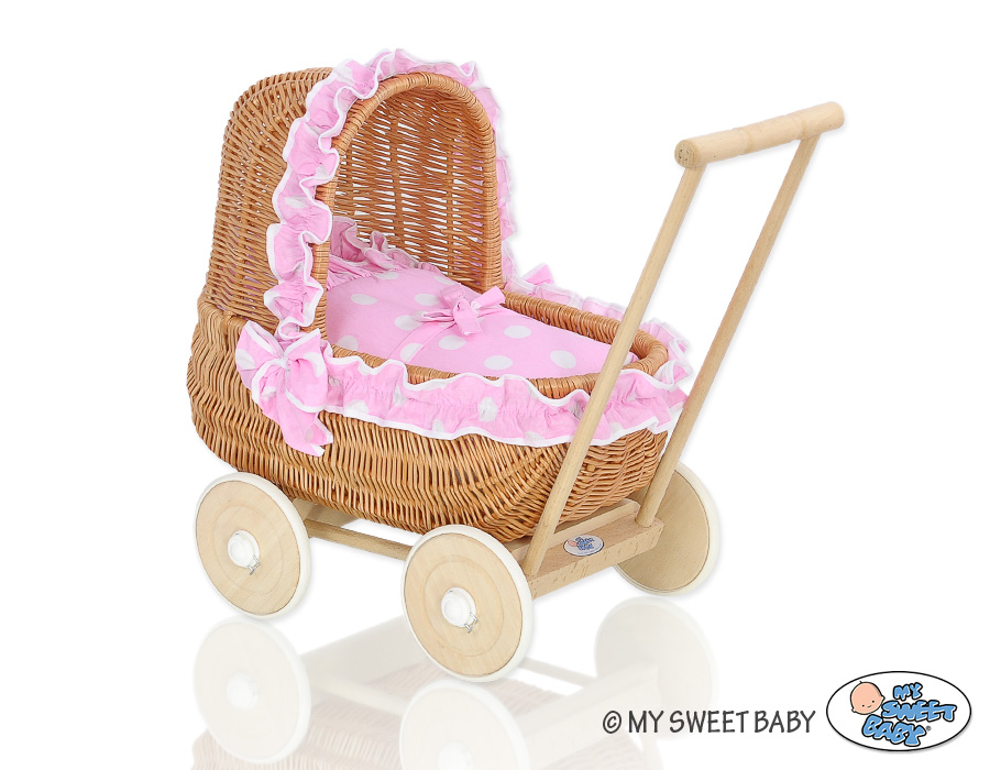 Stubenwagen » Spielzeug Kuscheltiere » Puppenwagen und Spielzeug » Puppenwagen aus Weide » Weide Puppenwagen Bettwäsche Rosa Punktmuster nr 1699-736