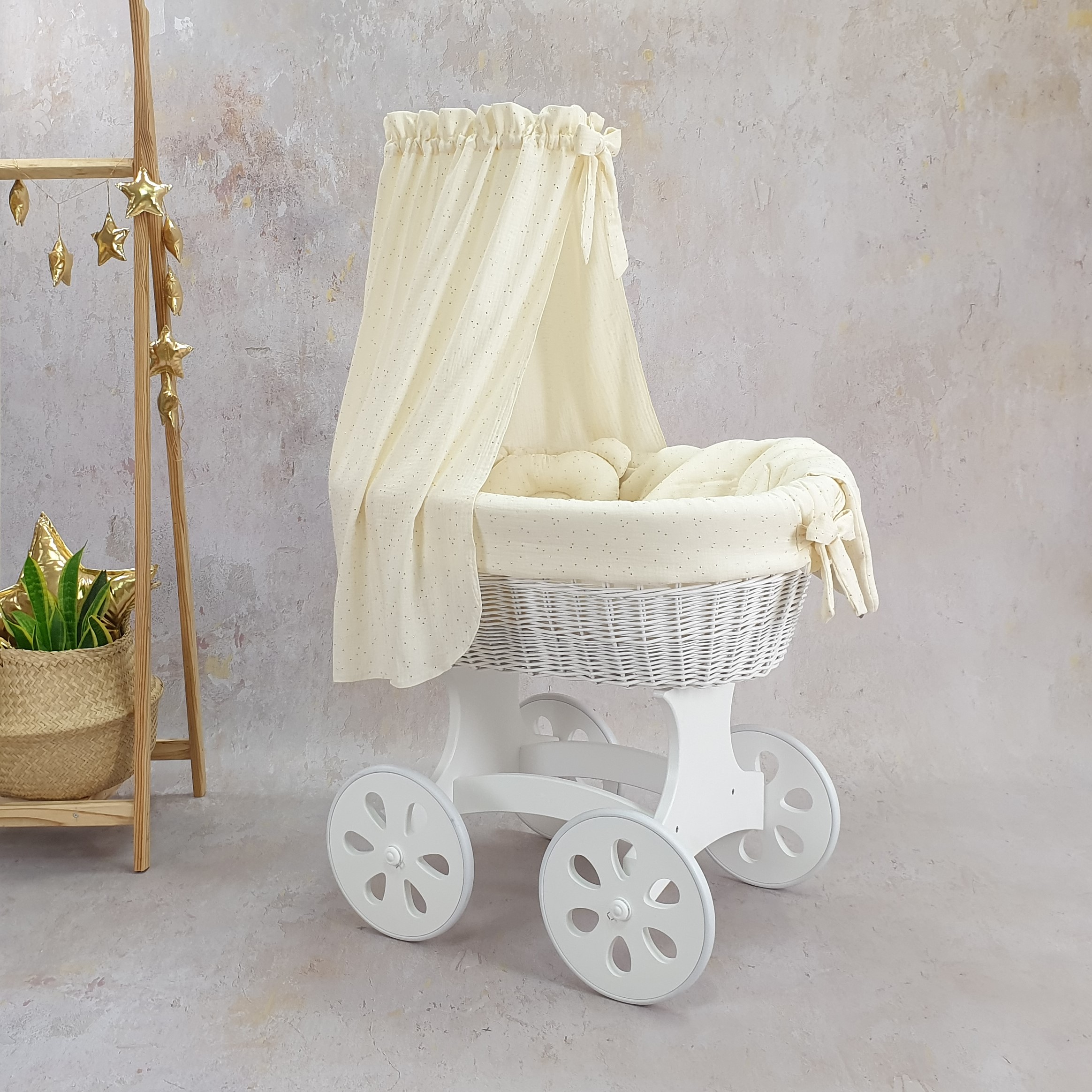 Das solide Holzgestell ist aus hochwertigem Buchenholz gefertigt. Die drehbaren Holzräder mit zwei Bremsen gewährleisten die Sicherheit Ihres Kindes und ermöglichen gleichzeitig eine einfache Handhabung des Wagens. Jeder unserer Stubenwagen wird von Hand aus natürlicher, hochwertiger polnischer Weide geflochten und mit einer sicheren, umweltfreundlichen Farbe bemalt, die alle erforderlichen Normen erfüllt.