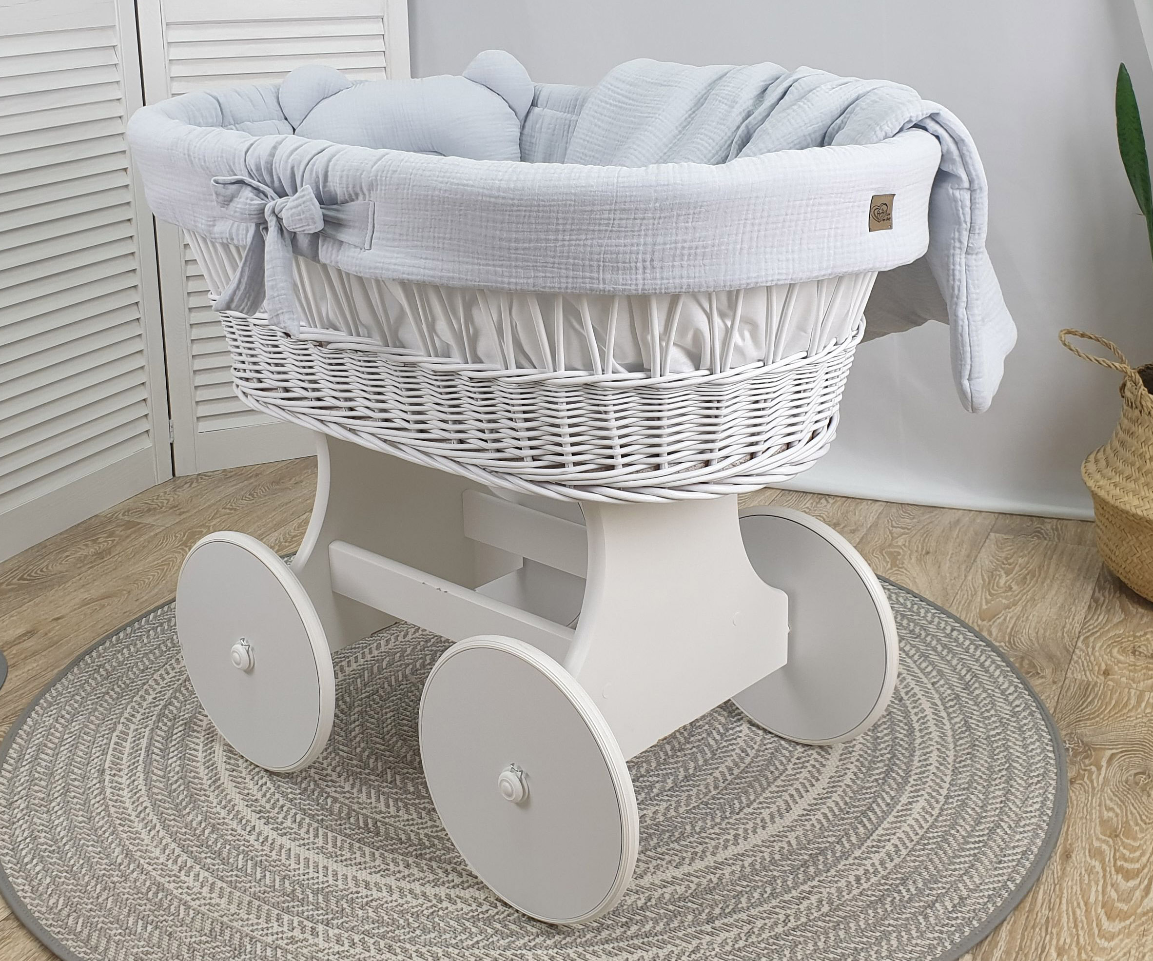 Der geräumige Korb mit den Maßen 90x55x30 cm, geflochten aus natürlicher, hochwertiger polnischer Weide, ist auf einem soliden Gestell montiert, das mit großen, gummierten Rädern ausgestattet ist. Diese Räder lassen sich sanft und leise bewegen und bieten mehr Stabilität im Vergleich zu kleineren Rollen. Sie sind ideal für Eltern, die den Wagen zwischen Räumen mit unterschiedlichen Bodenbelägen oder Schwellen schieben möchten, da die großen Räder leicht über solche Hindernisse rollen, ohne dabei laute Geräusche zu verursachen.