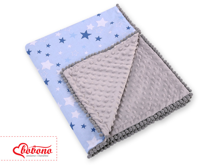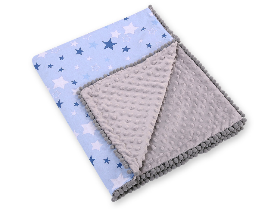 Stubenwagen » Bettwäsche für Babys » Bettwäsche für Babybett FUN & JOY » Wendedecke doppelseitig mit Pompons (mit Minky) » Wendedecke doppelseitig mit Pompoms (mit Minky) - blaue Sternen