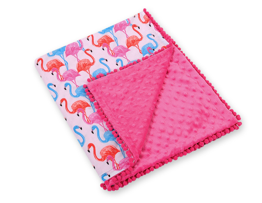 Stubenwagen » Bettwäsche für Babys » Bettwäsche für Babybett FUN & JOY » Wendedecke doppelseitig mit Pompons (mit Minky) » Wendedecke doppelseitig mit Pompoms (mit Minky) - Flamingo