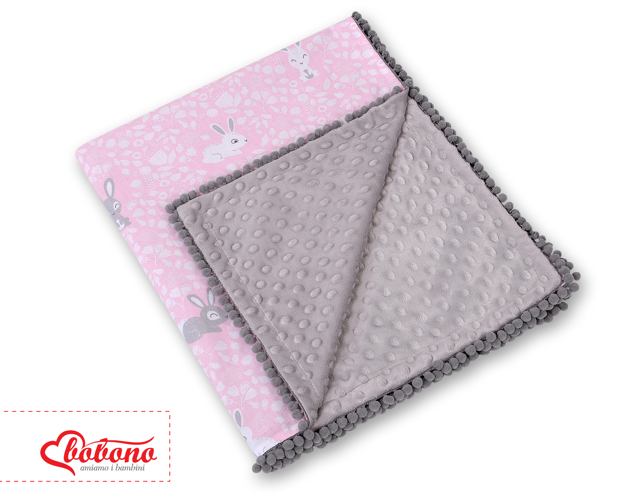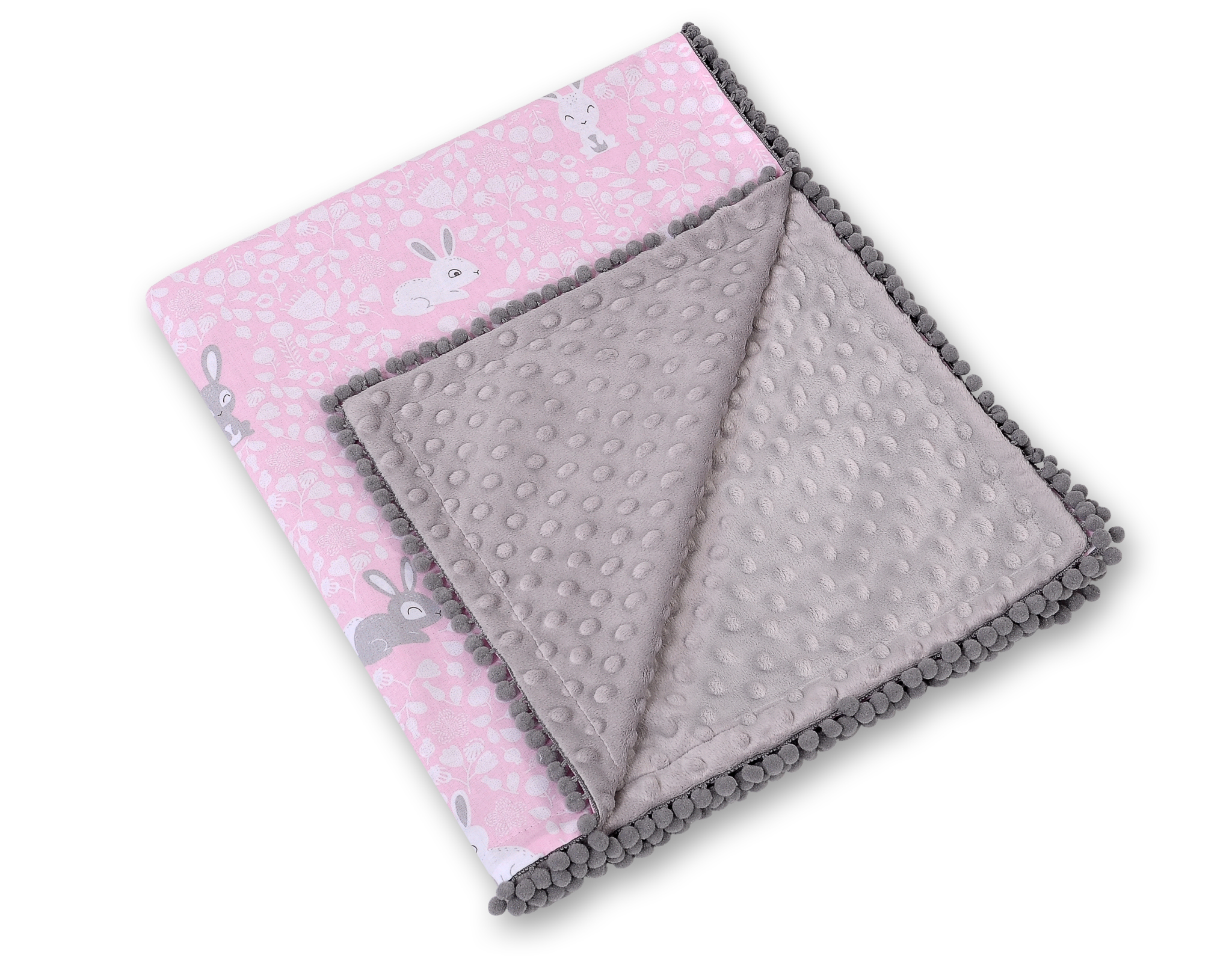 Stubenwagen » Bettwäsche für Babys » Bettwäsche für Babybett FUN & JOY » Wendedecke doppelseitig mit Pompons (mit Minky) » Wendedecke doppelseitig mit Pompons - rosa Hasen