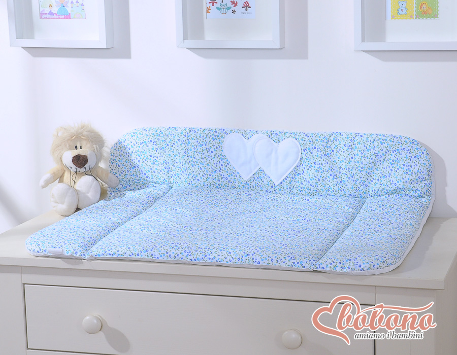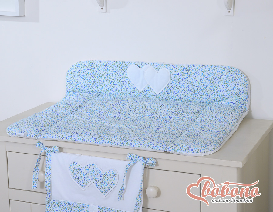 Wickelauflage auf Wickeltisch - Hängende Herzen blaue BlümchenWickelauflage auf Wickeltisch - Hängende Herzen blaue BlümchenWickelauflage auf Wickeltisch - Hängende Herzen blaue Blümchen